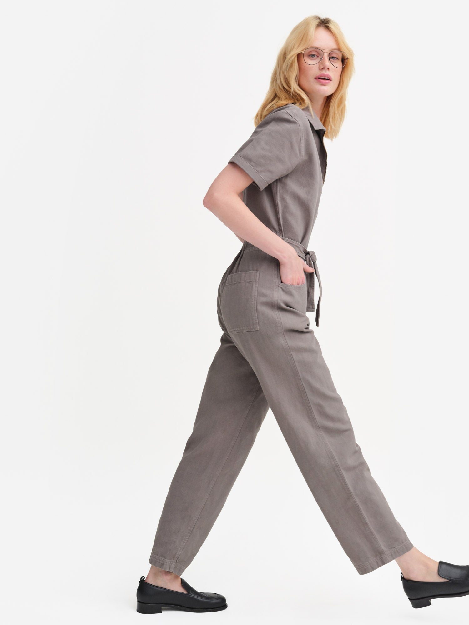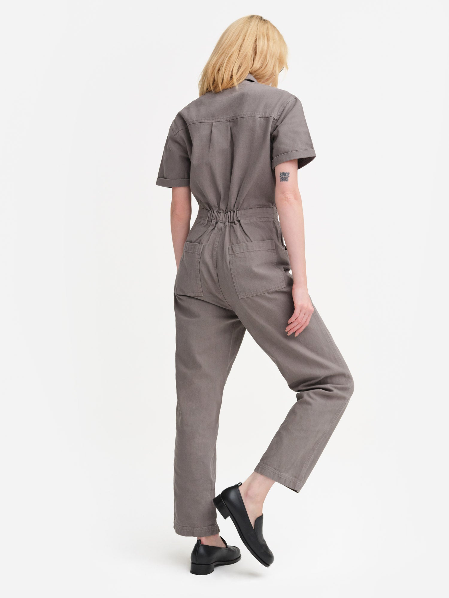 Organic Cotton Canvas Jumpsuit. Zipper-down short sleeve jumpsuit with elastic cinched waistband in back and attached cotton canvas belt.