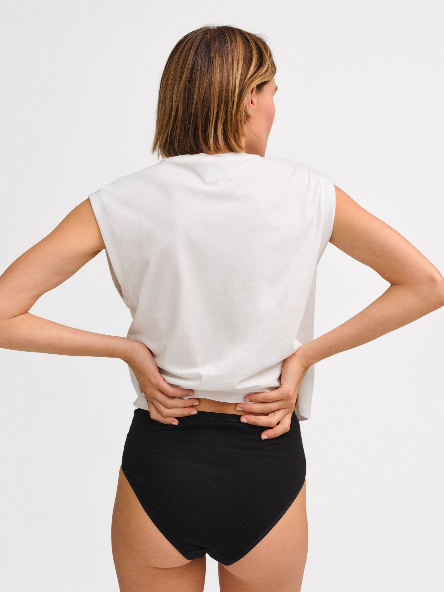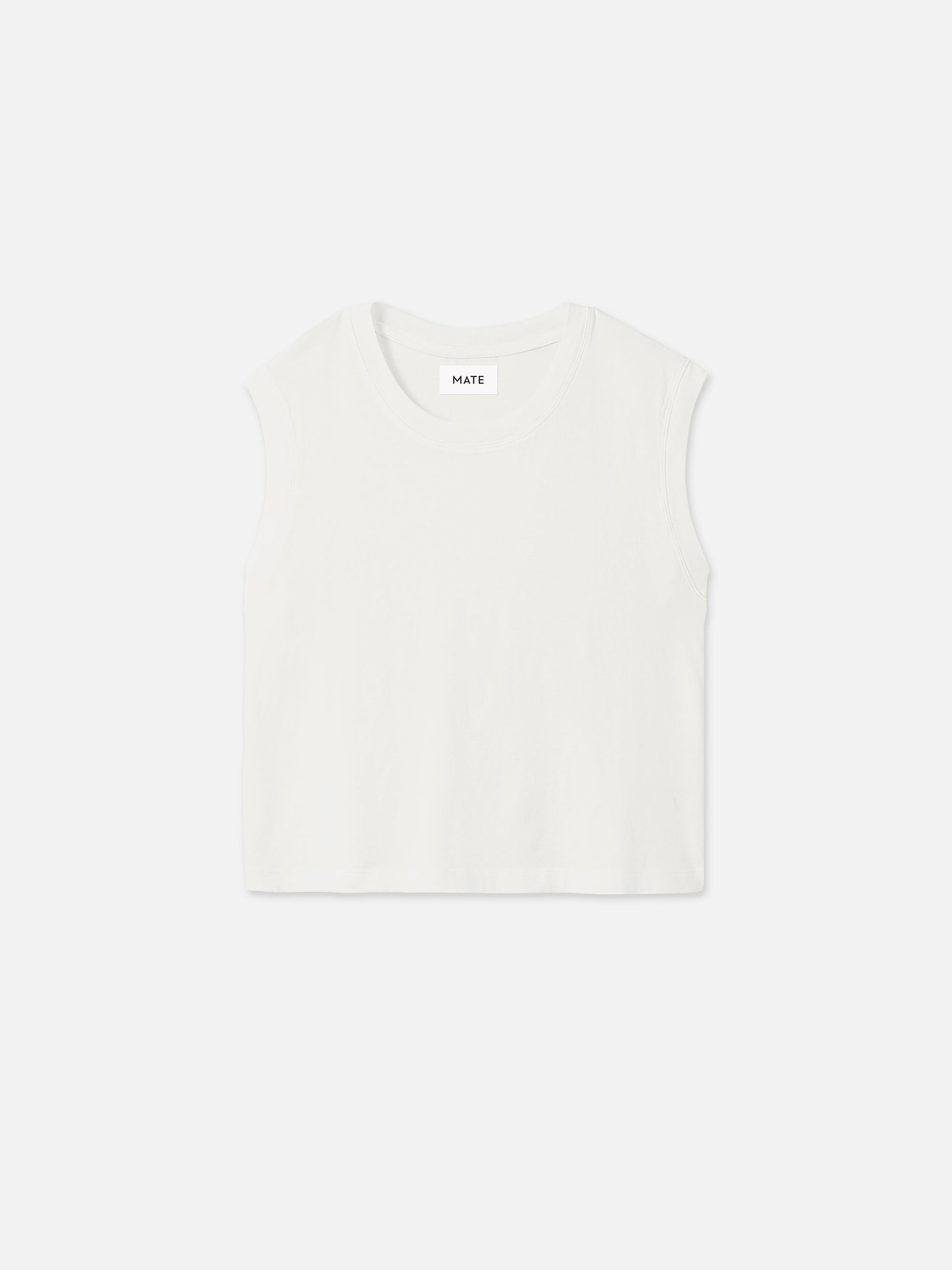 GOTS Certified Organic Cotton Muscle Tank. Boxy fit muscle tank with rib neck and armhole and a slightly cropped length. 20" length on size S.
