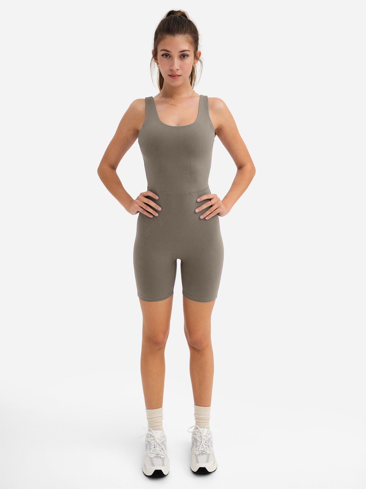 GOTS Certified Organic Stretch Unitard. Double layered supportive top and scoop back design made for low impact activity. Made without a front rise seam for a more flattering fit, 6" inseam.