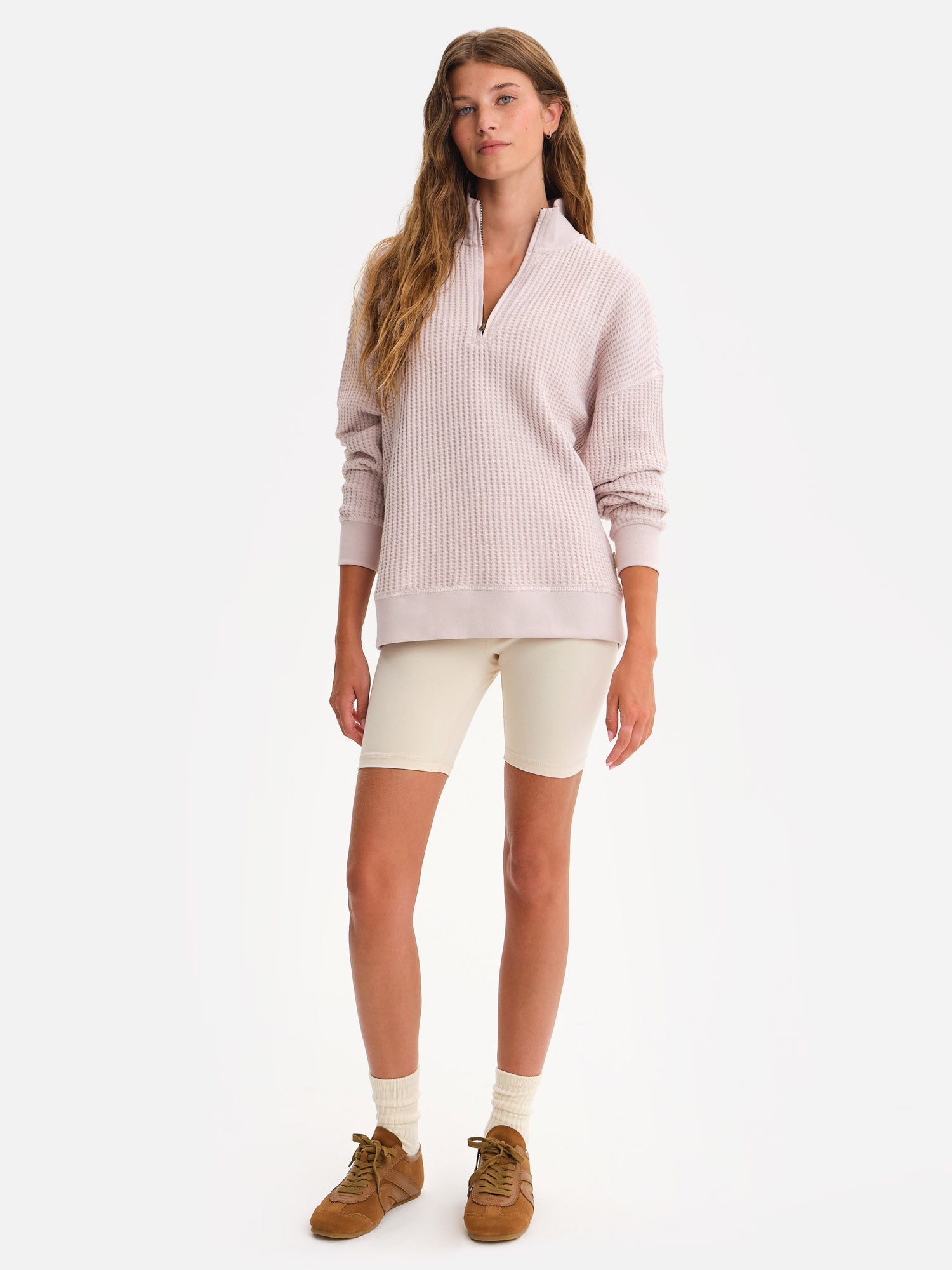 GOTS Certified Organic Waffle Collared Half-Zip Sweatshirt. Features ribbed sleeve cuffs and bottom hem.