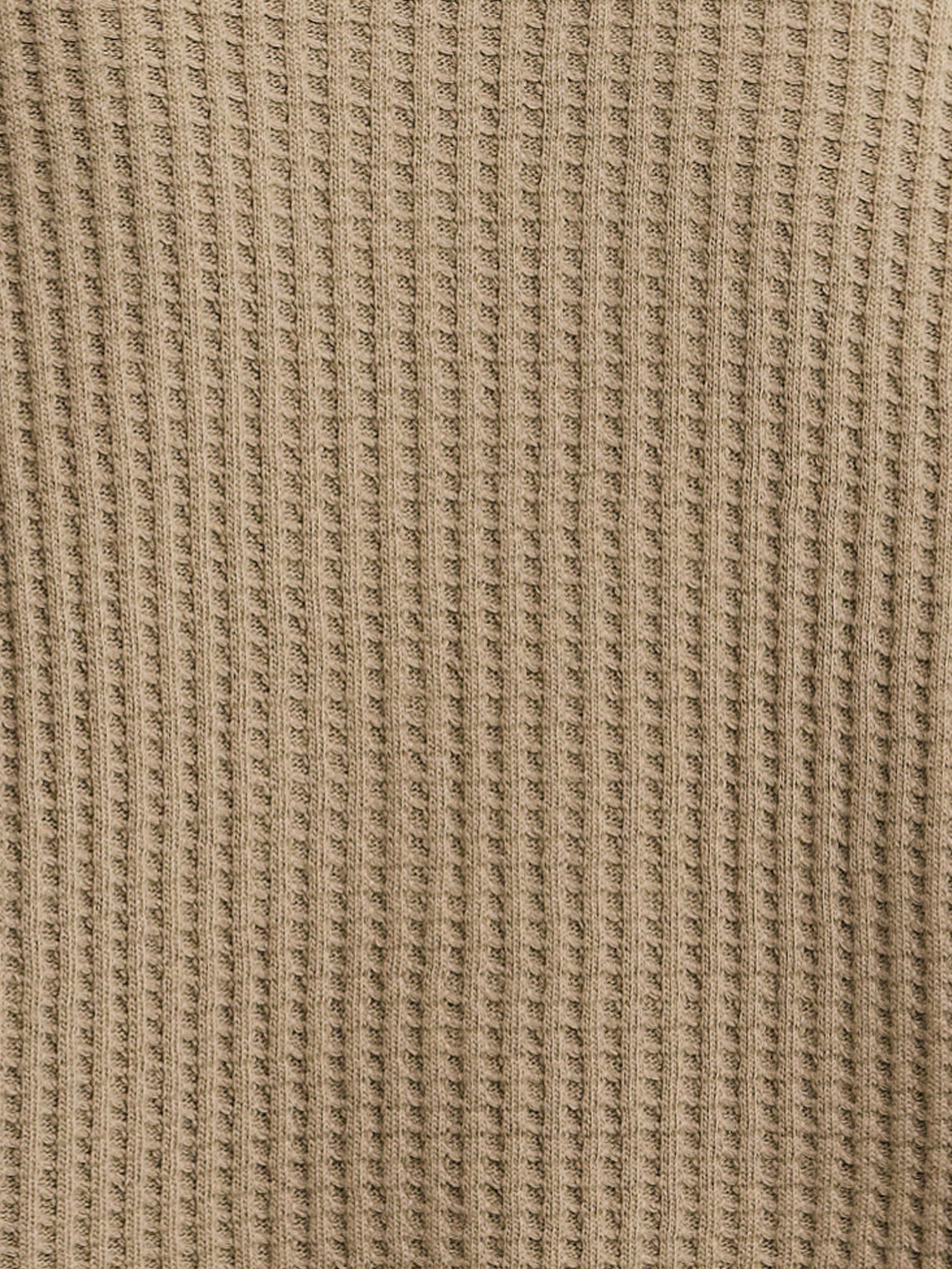 GOTS Certified Organic Waffle Collared Half-Zip Sweatshirt. Features ribbed sleeve cuffs and bottom hem.