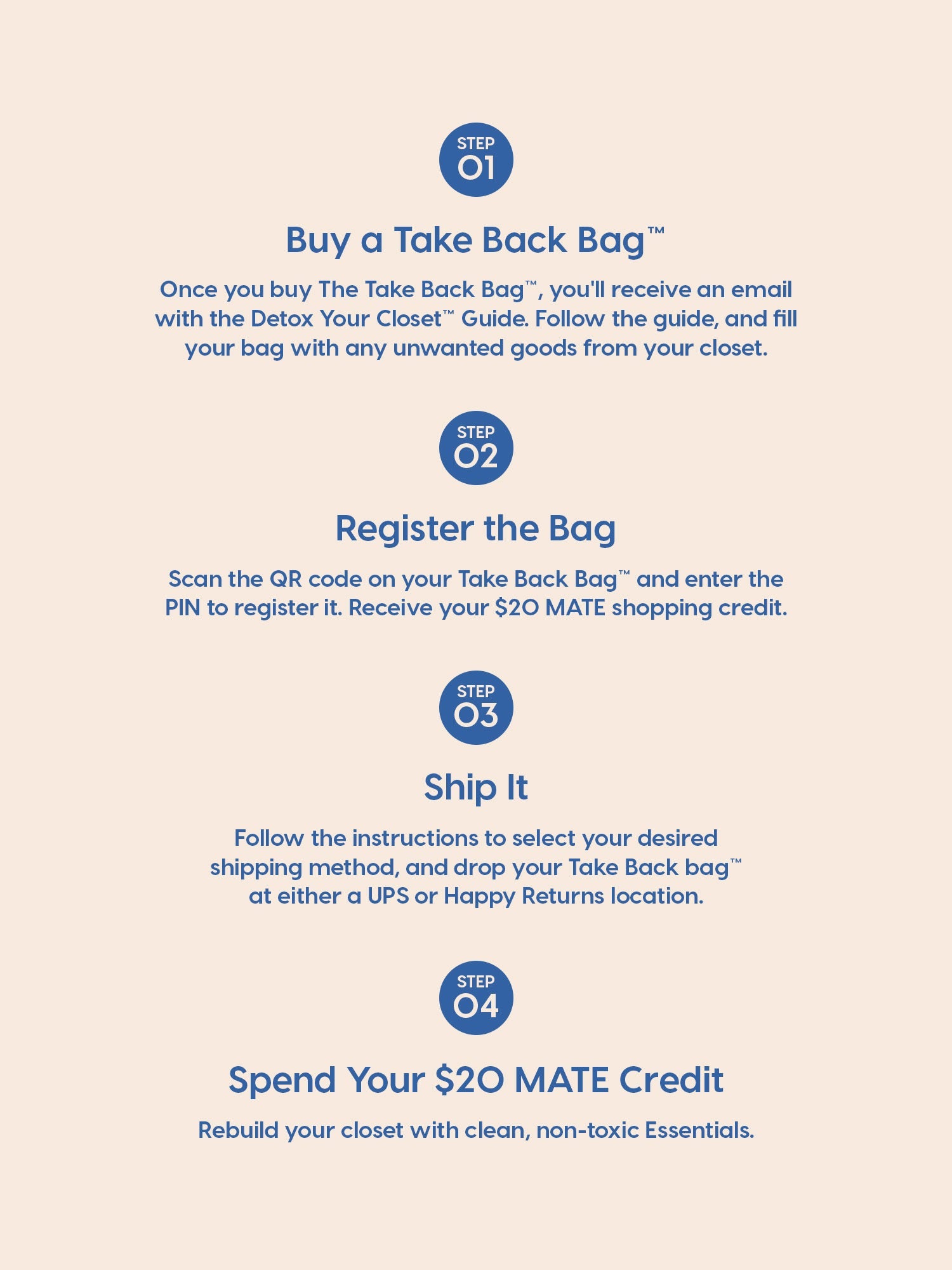 Let's Detox Your Closet™. Here's what to do: order a Take Back Bag, clean out your closet, and send us your filled bag. You'll earn $20 in MATE shopping credit towards your next purchase when you register your Take Back Bag.